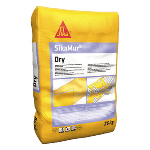 SikaMur® Dry gotov, isušujući renovacijski mort s makro porama, klase R prema EN 998-1. Sastoji se od posebnih aditiva za uvođenje zračnih pora, agregata, vapna, cementa, prikladan za isušivanje i obnovu ziđa izloženih porastu vlage. SikaMur® Dry je namijenjen za ručnu ugradnju.